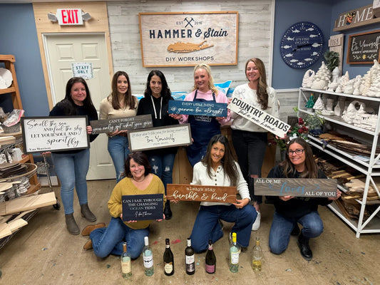 Celebrate special moments with a hands-on creative experience at Hammer and Stain Huntsville. Gather your friends, family, or co-workers for a fun, personalized workshop in a relaxed setting. Choose your date, secure your spot with a deposit, and meet the guest minimum to enjoy a private event. If you have a smaller group, you can always reserve a table at a public workshop. Let’s get crafting!