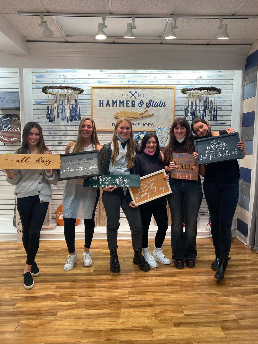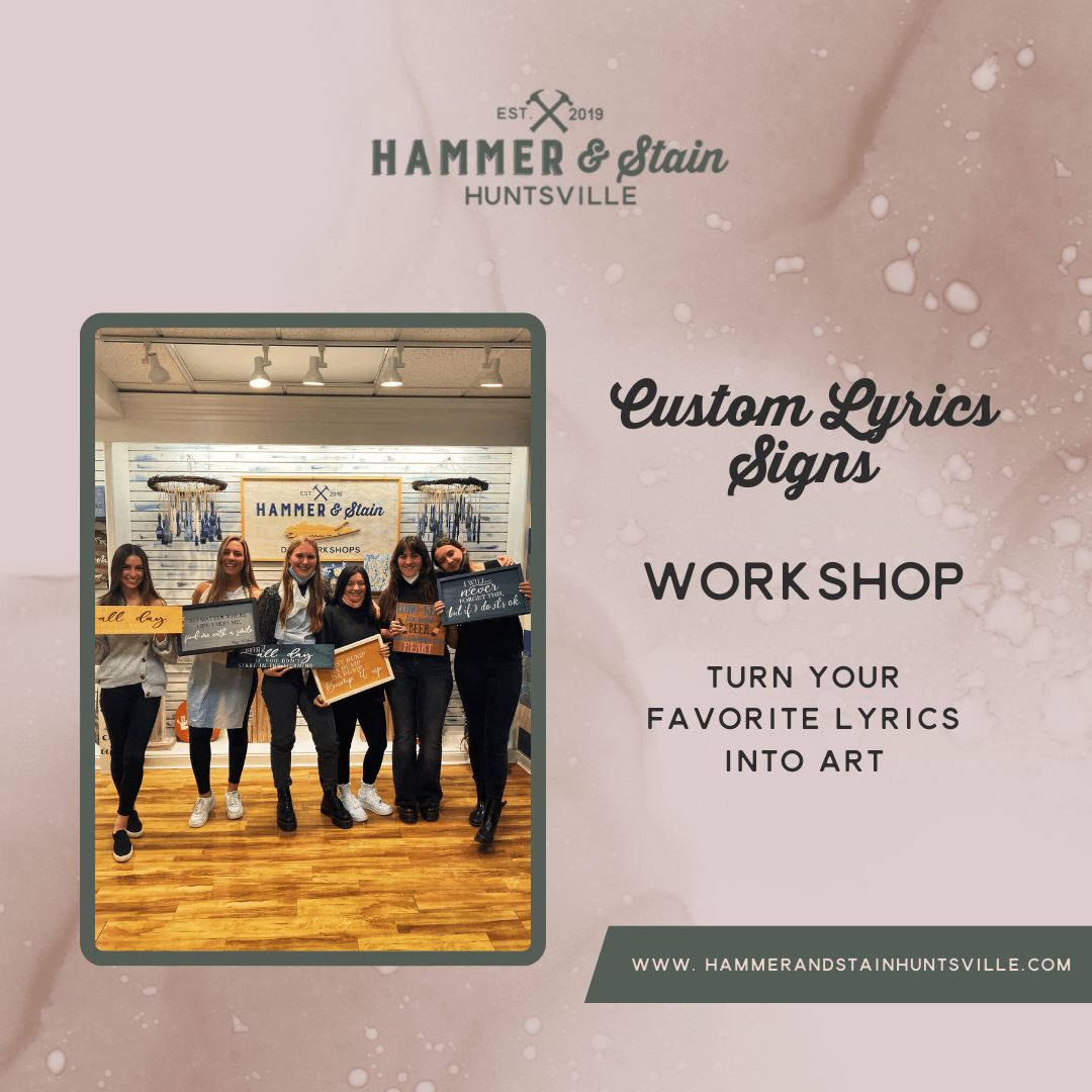 Join us at Hammer & Stain Huntsville for a creative and personal workshopāCustom Lyric Signs! In this class, youāll design a sign featuring your favorite lyrics from a song that speaks to you. Whether itās a romantic ballad, a motivational anthem, or a cherished classic, your sign will be a meaningful piece of dĆ©cor to display or gift to someone special. š¶š